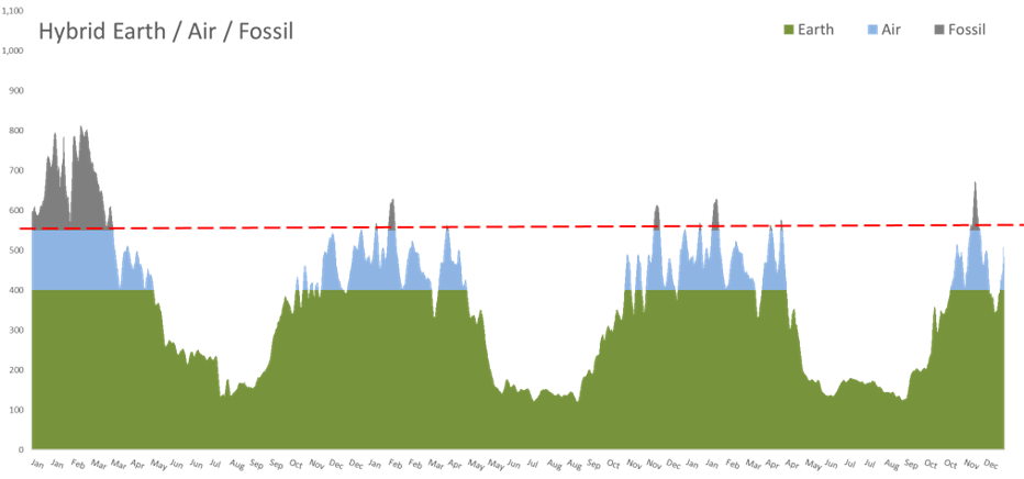 Example: “80% of the heating load covered by geo-exchange = 95% of hours, with better overall system performance”. Covering that last 5% may make the system 20% bigger, a totally unnecessary expansion.